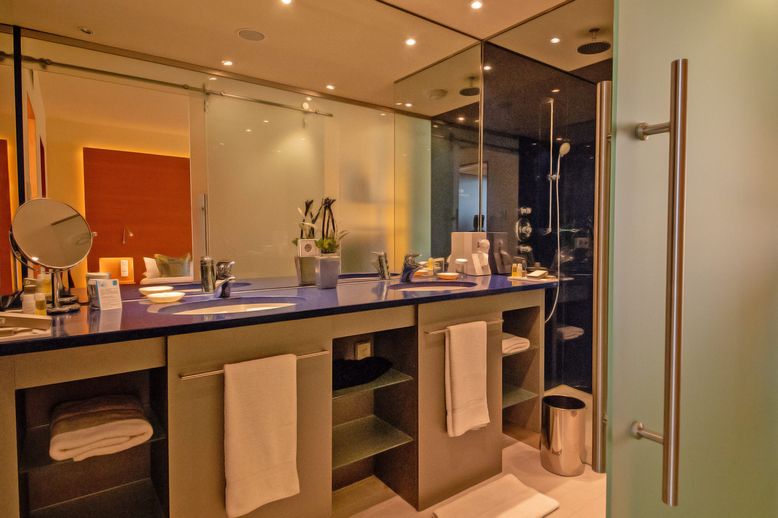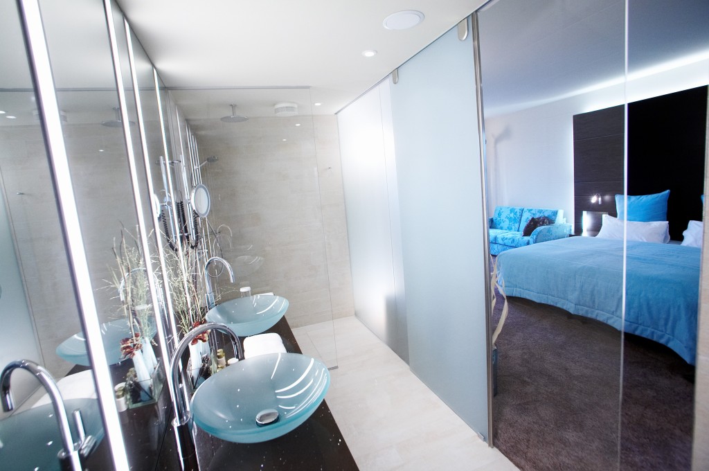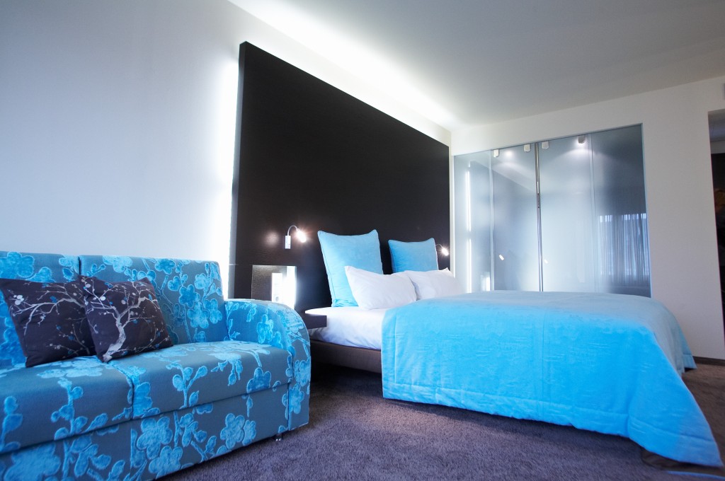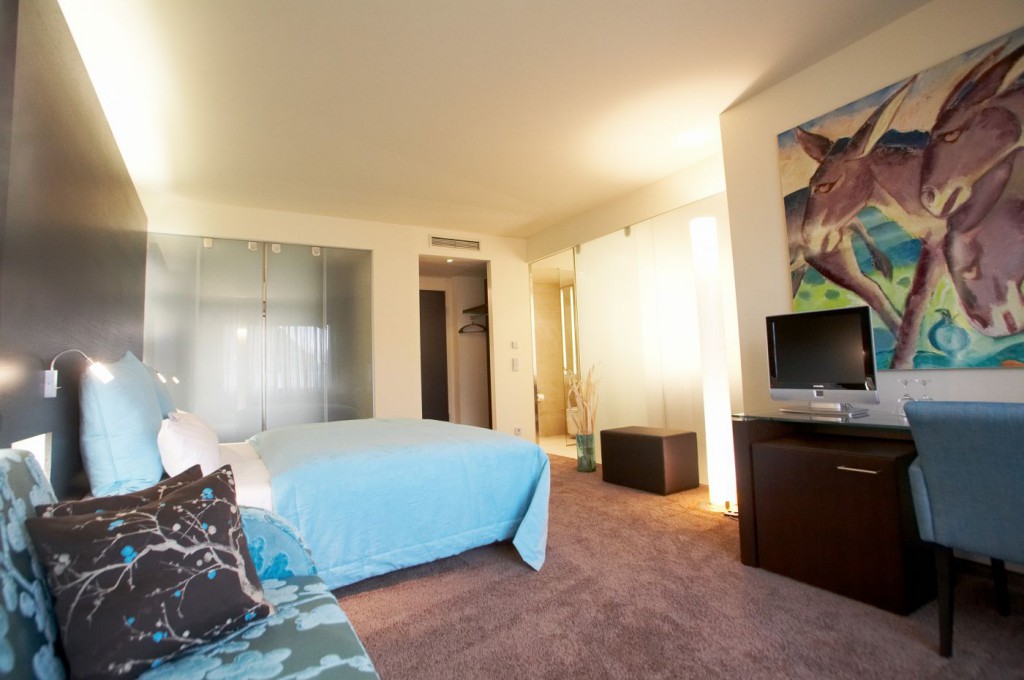 The luxurious junior suites on the garden side, consist of a combined living room and bedroom with additional sofa bed that can be pulled out for 1 child if needed. The walk-in closet and the bathroom with glass shower offer a pleasant luxury. The junior suite is available in two different color combinations - royal blue/light green or turquoise/brown. The bed is 180 x 200 cm.